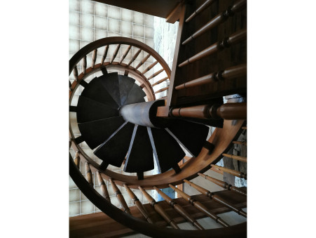 L’escalier, réalisé sur mesure en béton et bois de forme hélicoïdale, constitue une véritable œuvre d’art — unique, stable et remarquablement intégrée à l’esprit de la maison.