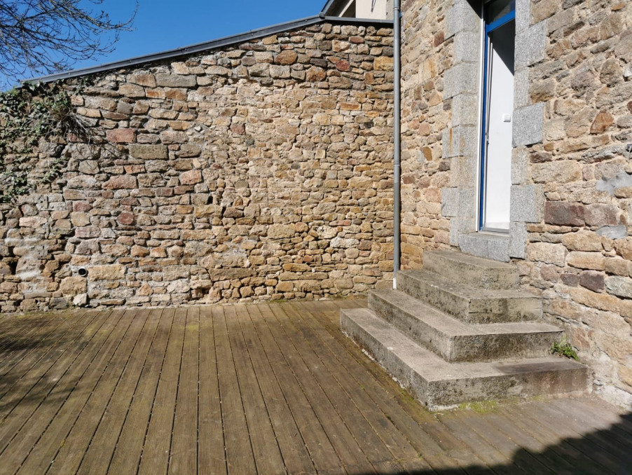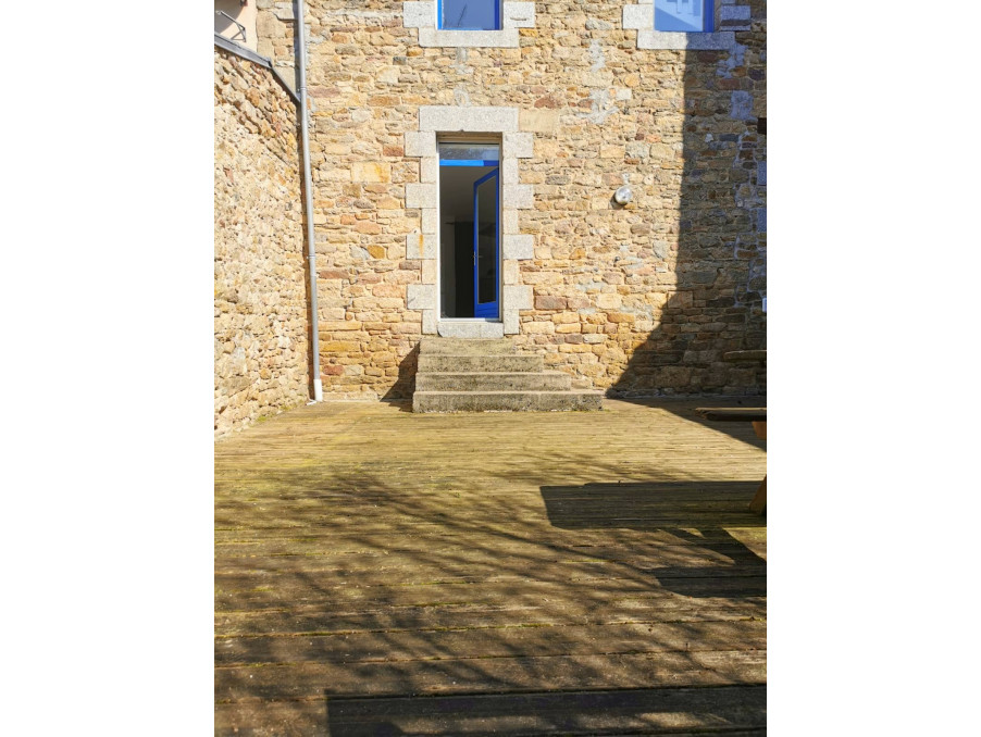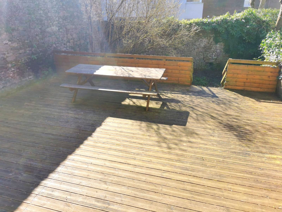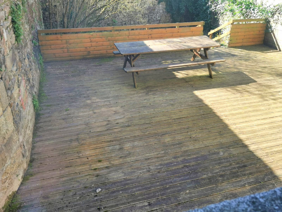 À l'arrière, une belle terrasse en bois de 50m² environ avec un petit coin jardin.