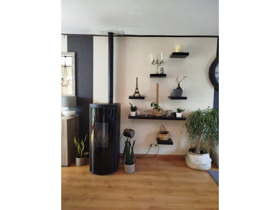 Un spacieux salon séjour traversant de près de 30 m², agrémenté d’un poêle à pellets, pièce lumineuse grâce à ses ouvertures,
