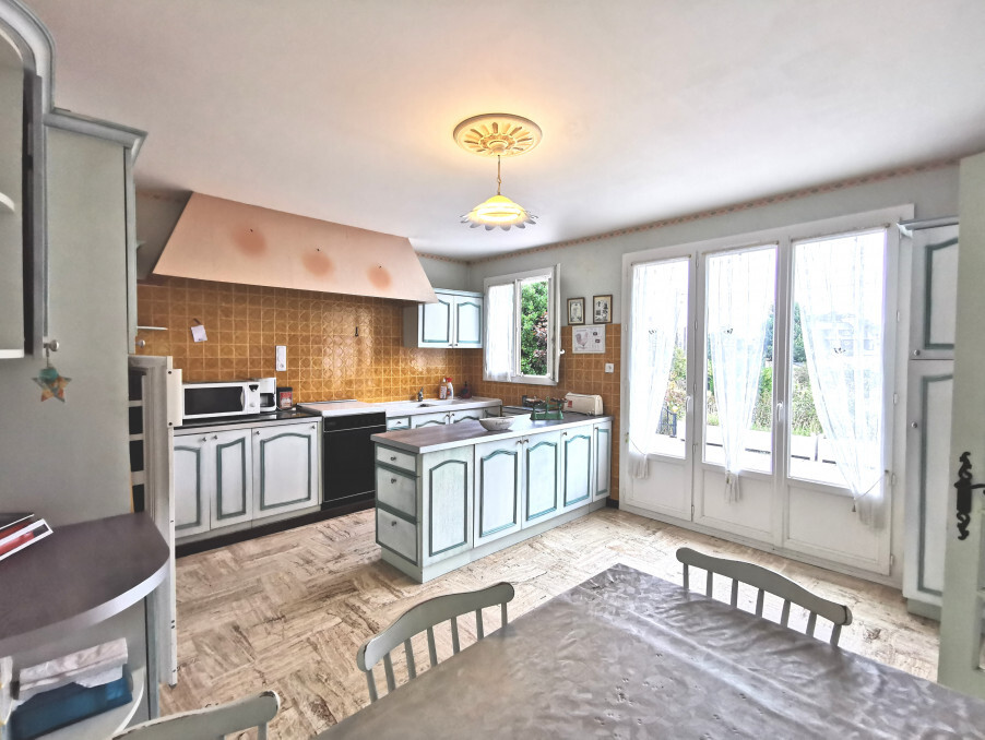 La salle à manger de 26m² donnant sur la terrasse est ouverte sur le salon séjour de 25m² avec cheminée à foyer ouvert (aujourd'hui condamné par une simple plaque de plâtre)